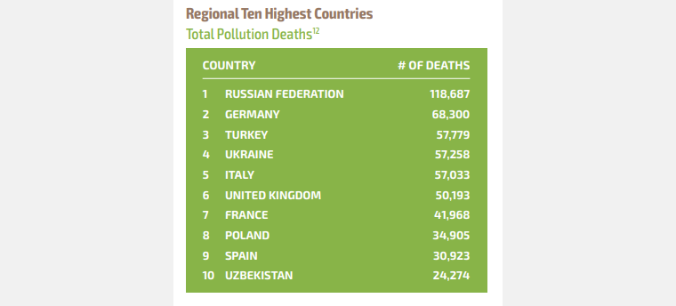 Украина попала на четвертую позицию рейтинга европейских стран по количеству смертей, обусловленных загрязнением окружающей среды. Об этом сообщается на сайте глобального альянса по вопросам здоровья и загрязнения (GAHP).