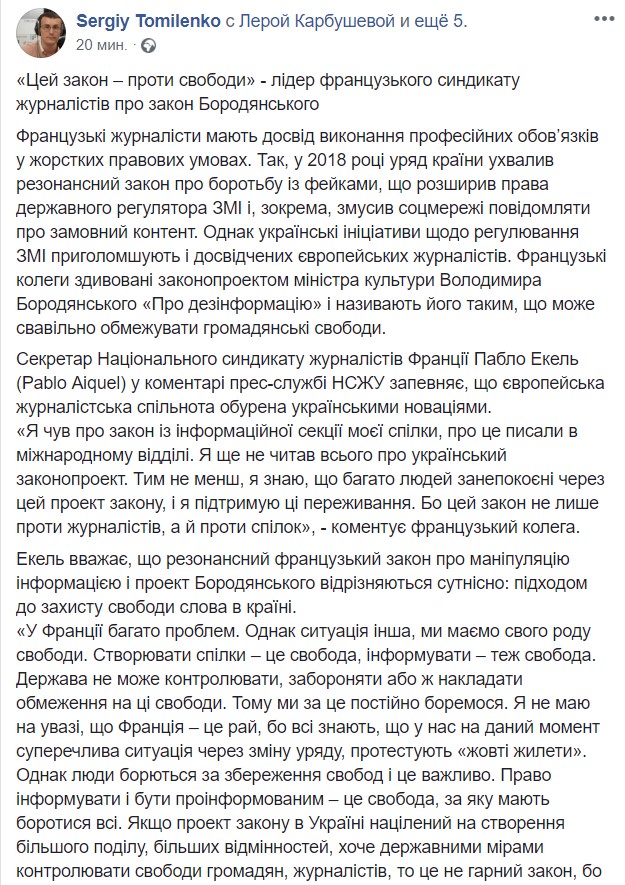 "Я слышал о законе по информационной секции моего союза, об этом писали в международном отделе. Я еще не читал всего об украинском законопроекте. Тем не менее, я знаю, что многие люди обеспокоены этим проектом закона, и я поддерживаю эти переживания. Потому что этот закон не только против журналистов, но и против союзов", - комментирует французский коллега.