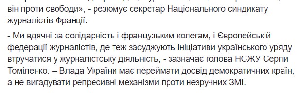 В свою очередь Сергей Томиленко заявил, что украинские власти должны перенимать опыт демократических стран, а не придумывать репрессивные механизмы против неудобных СМИ.