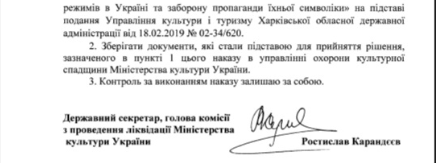 Фото приказа Минкульта о памятнике Жукову в Харькове