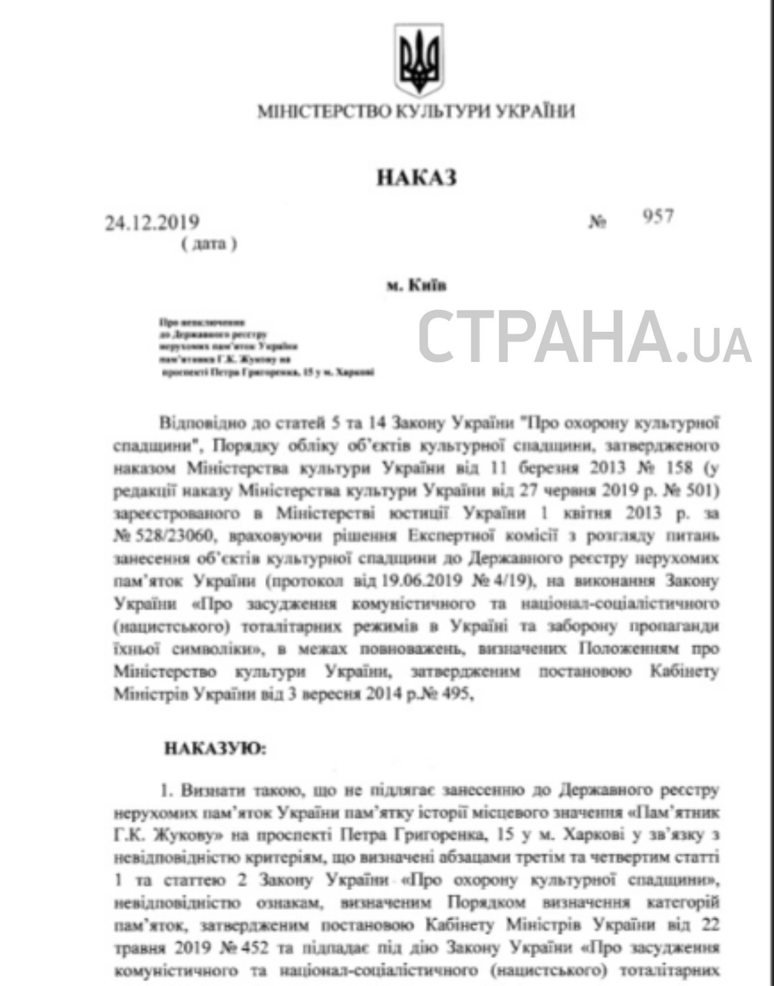 Приказ датирован 24 декабря 2019 года. В тексте говорится, что памятник Георгию Жукову на проспекте Григоренко в Харькове не подлежит занесению в Госреестр недвижимых памяток Украины и попадает под действие закона "Об осуждении коммунистического и национал-социалистического тоталитарных режимов в Украине и запрете пропаганды их символики".