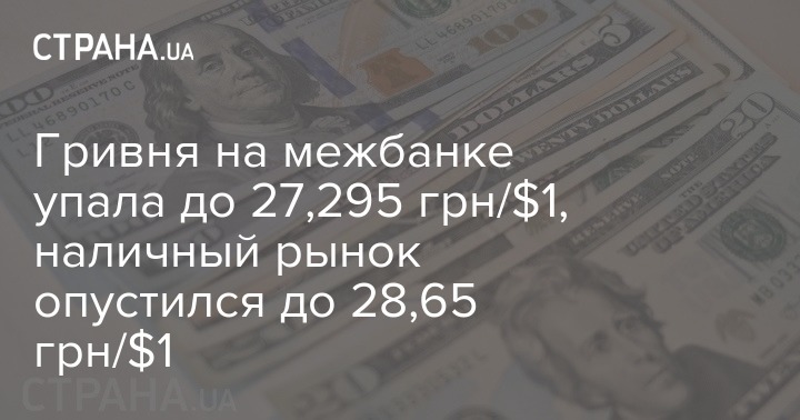 Гривня на межбанке упала до 27,295 грн/$1, наличный рынок опустился до 28,65 грн/$1