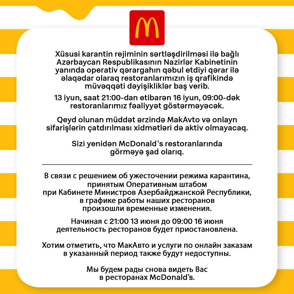 Так, например, заведения быстрого питания в Азербайджане дублируют на двух языках не только меню, но и важную информацию о графике работы ресторанов.
