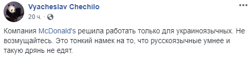 "Компания McDonald's решила работать только для украиноязычных. Не возмущайтесь. Это тонкий намек на то, что русскоязычные умнее и такую дрянь не едят", – иронизирует журналист Вячеслав Чечило.