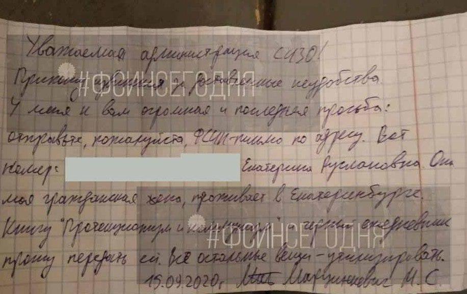Кроме того, Марцинкевич оставил предсмертную записку, в которой написал, что не хочет доставлять неприятностей администрации СИЗО-3 Челябинска. Он попросил передать своей гражданской супруге в Екатеринбург книгу "Протекционизм и коммунизм" Фредерика Бастиа и личный дневник. Записка заканчивается словами "Простите меня".