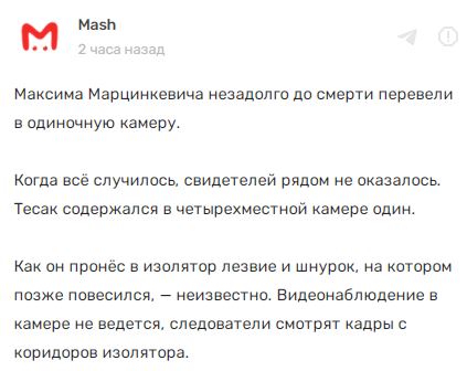 Также издание сообщает, что незадолго до смерти Марцинкевича перевели в одиночную камеру, поэтому свидетелей рядом не оказалось, а видеонаблюдение в камере не ведется. Как он пронес в изолятор лезвие и шнурок, на котором повесился, предстоит выяснить.