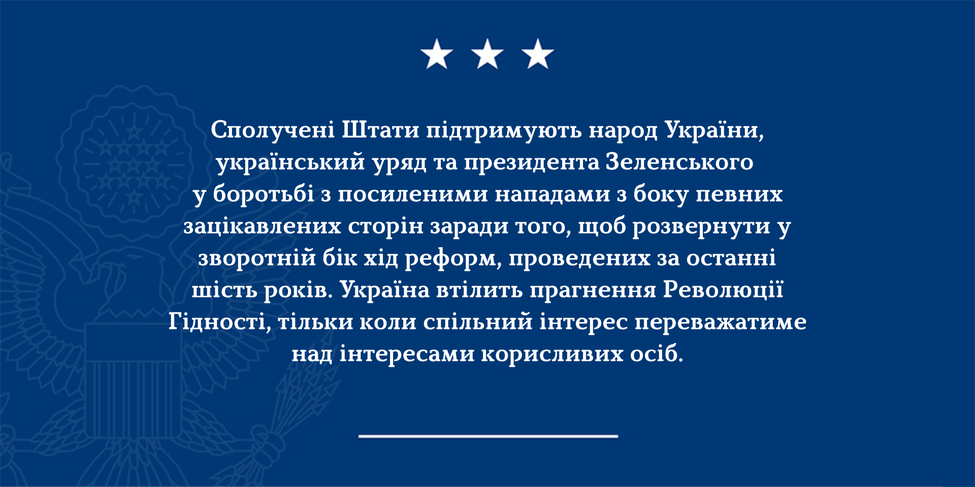 "Соединенные Штаты поддерживают народ Украины, украинское правительство и президента Зеленского в борьбе против усиливающихся нападок со стороны заинтересованных сторон, направленных на то, чтобы повернуть вспять ход реформ, проведенных за последние шесть лет", - говорится в сообщении.
