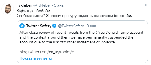 "Отбитые долбо@бы. Свобода слова? Жесткую цензуру подают под соусом борьбы", - написал Вчерашний 9 января, после того как аккаунт Трампа заблокировали вследствие "риска дальнейшего подстрекательства к насилию".