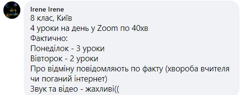 "8 класс, Киев. 4 урока в день в Zoom по 40 минут. Фактически: Понедельник – 3 урока, вторник – 2 урока. Про отмену сообщают по факту (болезнь учителя или плохой интернет). Звук и видео – ужасные", – сообщает Irene.