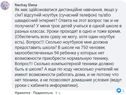 А еще по ходу несколько учителей не имеют возможности работать дома, и не потому, что нет техники, а не позволяют домашние условия (ведут уроки из кабинета информатики)", – спрашивает Елена Нечай.