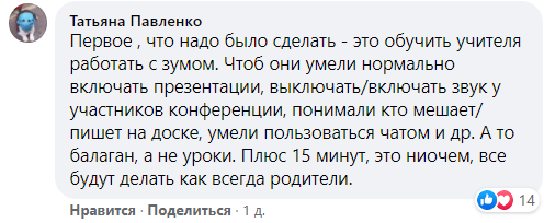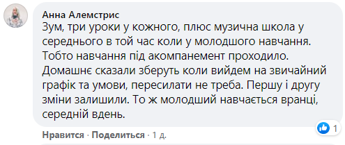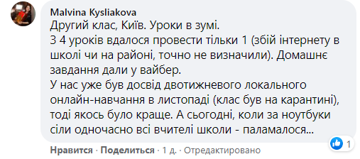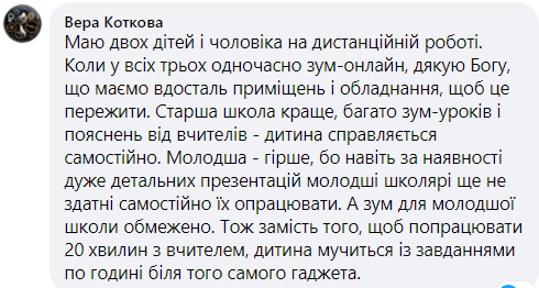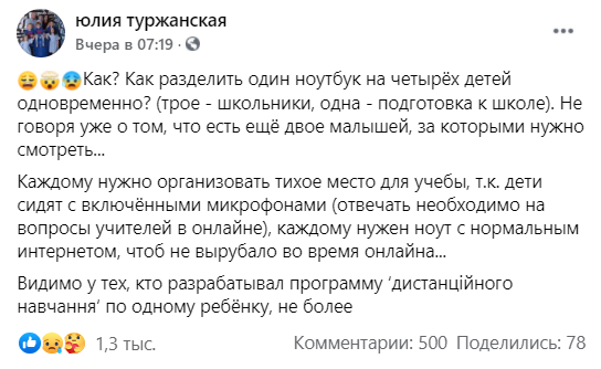Каждому нужно организовать тихое место для учебы, т.к. дети сидят с включенными микрофонами (отвечать необходимо на вопросы учителей в онлайне), каждому нужен ноут с нормальным интернетом, чтоб не вырубало во время онлайна. Видимо, у тех, кто разрабатывал программу "дистанційного навчання", по одному ребенку, не более", – пишет Юлия Туржанская в группе "Батьки SOS" в "Фейсбуке".