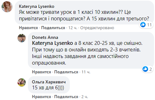 Другие родители недовольны продолжительностью онлайн-урока. Екатерина Лысенко не понимает, как может урок в 1 классе длиться 10 минут. "Это поздороваться и попрощаться? А 15 минут для третьего [класса]?".