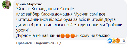 "3 класс. Все задания в Google-класс, вайбер. Классная и домашняя. Вынуждены были сами все читать, смотреть видео, я была за всех учителей. Второй ребенок 4 лет тынялся 4-5 часов пока мы "делали уроки". Дурдом, а не обучение, никому не пожелаю", – написала Ирина Марухно.