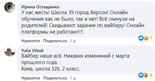 "Все скинули на родителей! Скидывают задания по Вайберу! Онлайн платформы не работают!" – пишет из Херсона Ирина Остащенко.