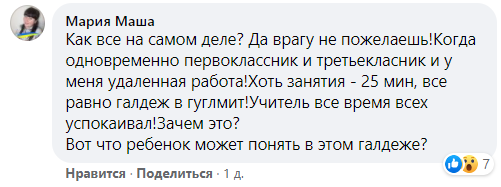 "Как все на самом деле? Да врагу не пожелаешь! Когда одновременно первоклассник и третьеклассник и у меня удаленная работа! Хоть занятия 25 мин, все равно галдеж в гуглмит! Учитель все время всех успокаивал! Зачем это?