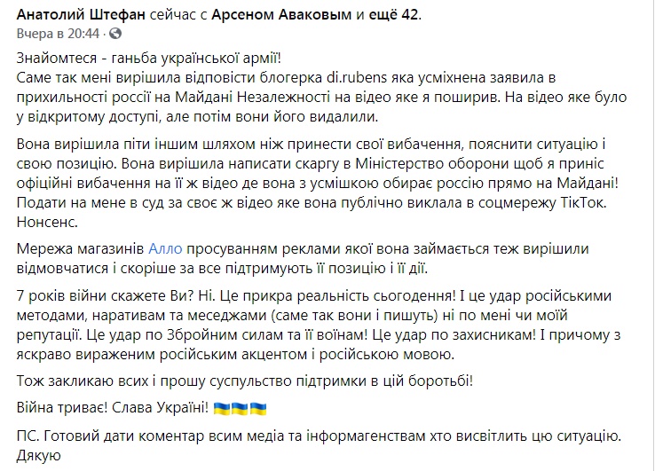 "Она решила пойти другим путем, чем принести свои извинения, объяснить ситуацию и свою позицию. Она решила написать жалобу в Министерство обороны, чтобы я принес официальные извинения о ее же видео, где она с улыбкой выбирает Россию прямо на Майдане! Подать на меня в суд за свое же видео, которое она публично выложила в соцсеть ТикТок. Нонсенс. 7 лет войны, скажете вы? Нет. Это досадная реальность настоящего! Это удар по Вооруженным силам и ее воинам! Это удар по защитникам! И причем с ярко выраженным русским акцентом и на русском языке. Поэтому призываю всех и прошу общество поддержки в этой борьбе!", - призвал "Штирлиц".