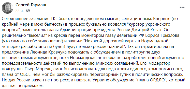 То есть речь идет о том, что Украина пытается снять вопрос "карты" с повестки минских переговоров и передать его в "Нормандию". Что также следует из приведенного выше поста Гармаша.
