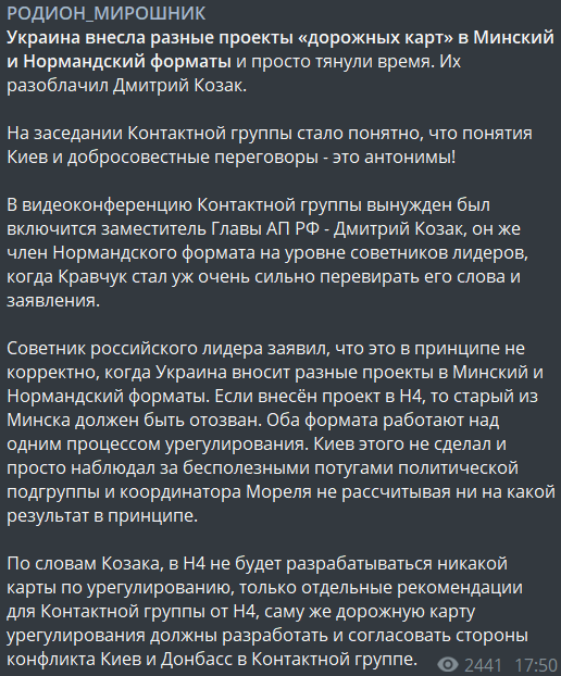 "Козак заявил, что это в принципе некорректно, когда Украина вносит разные проекты в Минский и Нормандский форматы. Если внесён проект в Н4, то старый из Минска должен быть отозван", - пересказал еще одну цитату российского чиновника представитель "ЛНР" в Минске Родион Мирошник.