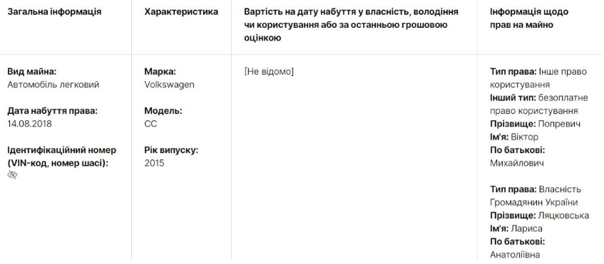 Попревич пользуется легковым автомобилем Volkswagen CC 2015 года выпуска, который приобрел в 2018 году у Ларисы Ляцковской.