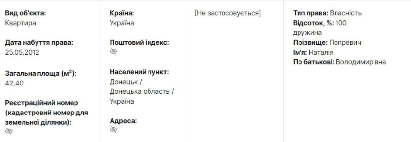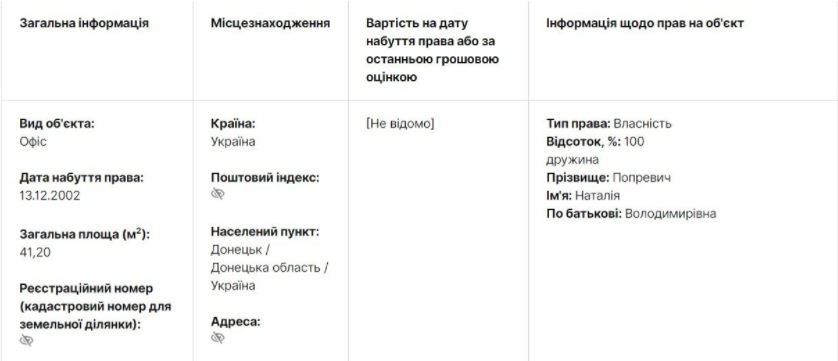 В декларации за 2019 год говорится о том, что у судьи осталась квартира площадью 42,40 кв.м и офис в Донецке площадью 41,20 кв.м, записанные на его жену Наталью.