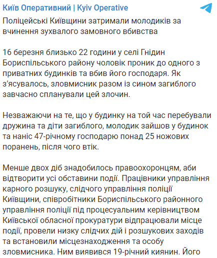 Убийство произошло около 22:00 16 марта в селе Гнедин Бориспольского района. Мужчина проник в один из частных домов и убил его хозяина.