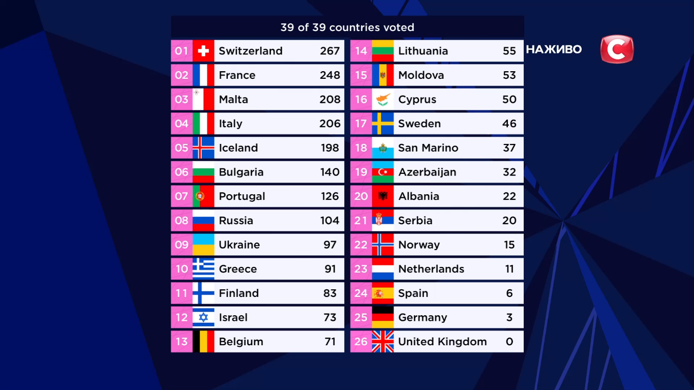 01:40 Украина получила от телезрителей со всего мира целых 267 баллов! С результатом в 364 балла Украина заняла первое место в турнирной таблице, обогнав Финляндию, Швейцарию и Францию. Но это еще не конец.
