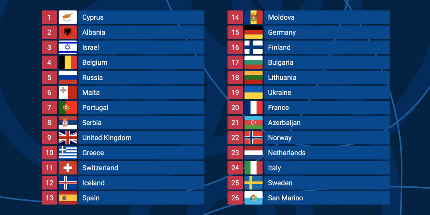 Украина сегодня выступает под номером 19. Вот порядок выступления исполнителей в финале конкурса.