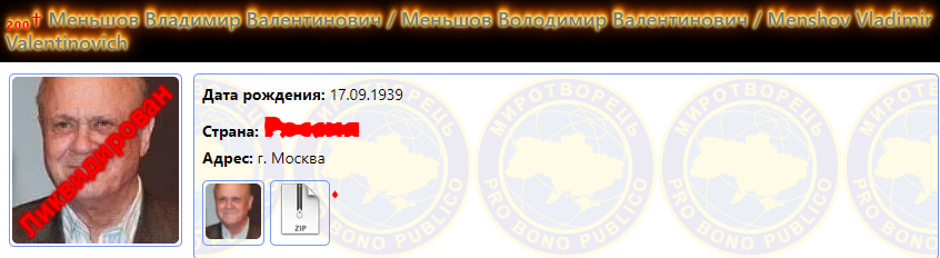 Одним из первых о смерти Меньшова отозвался скандальный сайт "Миротворец". Причем сделал это в своей специфической манере. Перечислив все "грехи" режиссера, его портрет перечеркнули словом "ликвидирован" несмотря на то, что Меньшов умер от Covid-19.