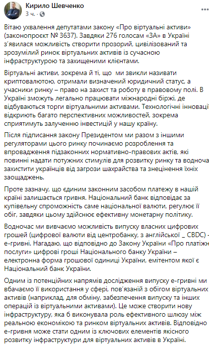 "В то же время мы изучаем возможность выпуска собственных цифровых денег (цифровой валюты от центробанка, с английского ̶ СBDC) - е-гривне. Напомню, что в соответствии с Законом Украины "О платежных услугах" цифровые деньги Национального банка Украины - электронная форма денежной единицы Украины, эмитентом которой является Национальный банк Украины",- написал Шевченко.