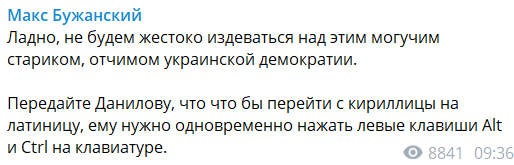 Передайте Данилову, что что бы перейти с кириллицы на латиницу, ему нужно одновременно нажать левые клавиши Alt и Ctrl на клавиатуре", - пишет нардеп Макс Бужанский.