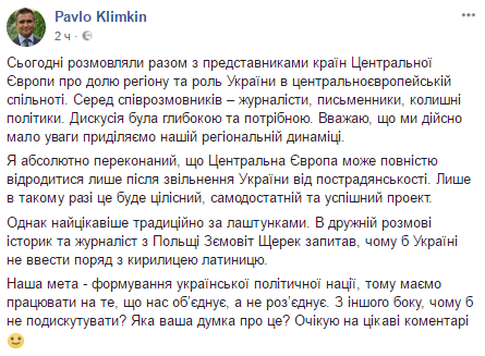 Наша задача - формирование украинской политической нации, поэтому надо работать на то, что нас объединяет, а не разъединяет. С другой стороны, почему бы не подискутировать?", – написал тогда Климкин.