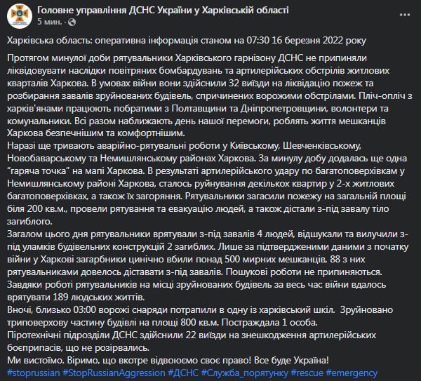 "Только по подтвержденным данным с начала войны в Харькове захватчики цинично убили более 500 мирных жителей, 88 из них спасателями пришлось доставать из-под завалов. Благодаря работе спасателей на месте разрушенных построек за все время войны удалось спасти 189 человеческих жизней", - сообщили в ГСЧС.