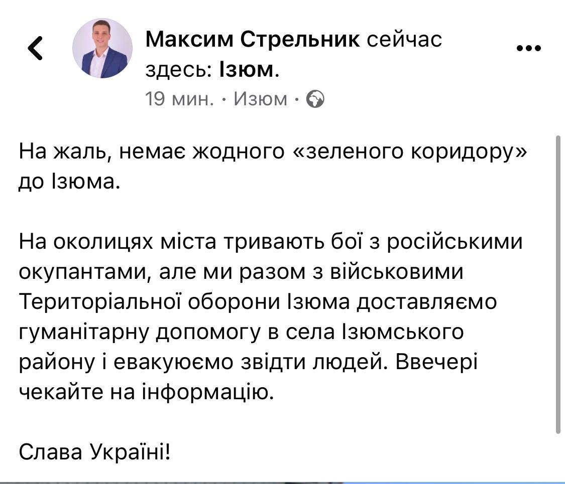 "К сожалению нет ни единого "зеленого коридора" в Изюм. На окраинах города продолжаются бои с российскими оккупантами, вместе с военными Территориальной обороны Изюма доставляем гуманитарную помощь в села Изюмского района и эвакуируем оттуда людей", - говорится в сообщении.
