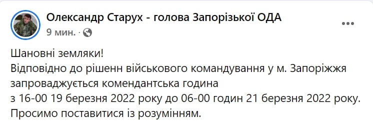 "Уважаемые земляки. В соответствии с решением военного командования в городе Запорожье вводится комендантский час с 16:00 19 марта 2022 года до 06:00 21 марта 2022 года", - говорится в сообщении.
