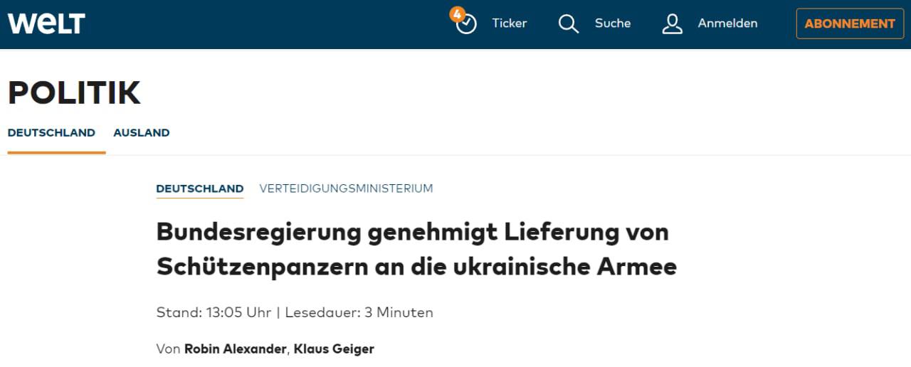 Федеральное правительство Германии одобрило поставку бронетранспортеров украинской армии. Об этом сообщает Welt am Sontag