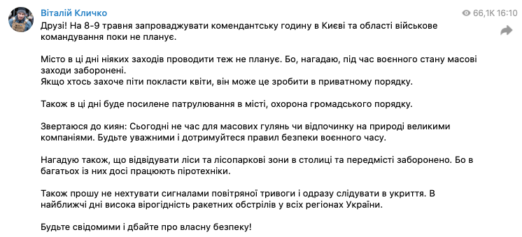 В Киеве не будет круглосуточного комендантского часа на 9 мая