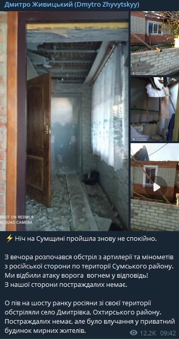 10:00 Сумскую область с вечера обстреливают из артиллерии и минометов с российской стороны. Под огнем Сумской и Ахтырский районы, пострадал жилой дом.