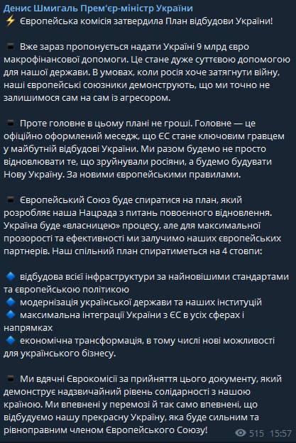 5. "Поблагодарил Урсулу фон дер Ляйен за оглашенный сегодня пакет помощи нашей стране объемом 9 млрд евро. А также за поддержку планов по восстановлению Украины. Говорил с новым президентом ОАЭ, обсудили угрозу глобальной продвольственной безопасности, которую спровоцировала Россия своим вторжением".