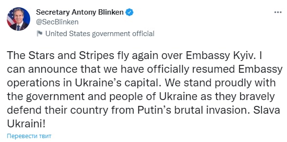 21.17 Блинкен официально подтвердил возвращение посольства США в Киев. Над зданием снова подняли звездно-полосатый флаг.