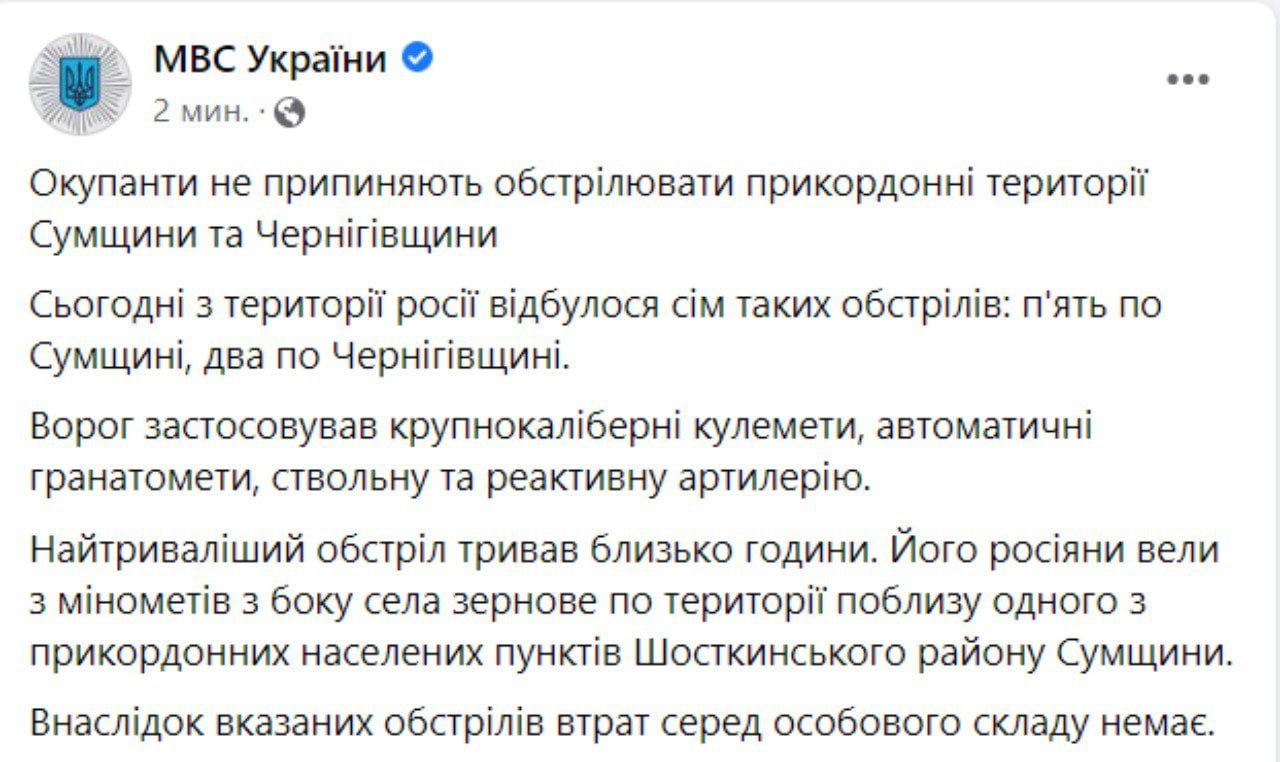 21.36 Сегодня с территории России произошло пять обстрелов по Сумской области и два по Черниговской. Об этом сообщает МВД на своей странице в Фейсбуке.