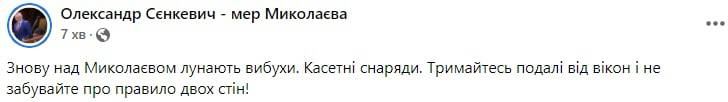 "Снова над Николаевом раздаются взрывы. Кассетные снаряды. Держитесь подальше от окон и не забывайте о правиле двух стен!" - написал Сенкевич.