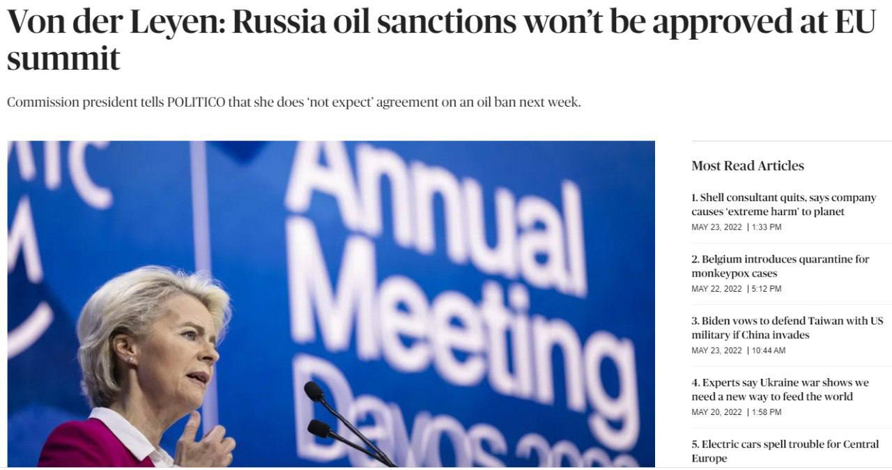 Кроме того, Bloomberg писал о том, что Евросоюз вряд ли одобрит запрет на российскую нефть на следующей неделе, поскольку Венгрия продолжает выступать против этой меры.