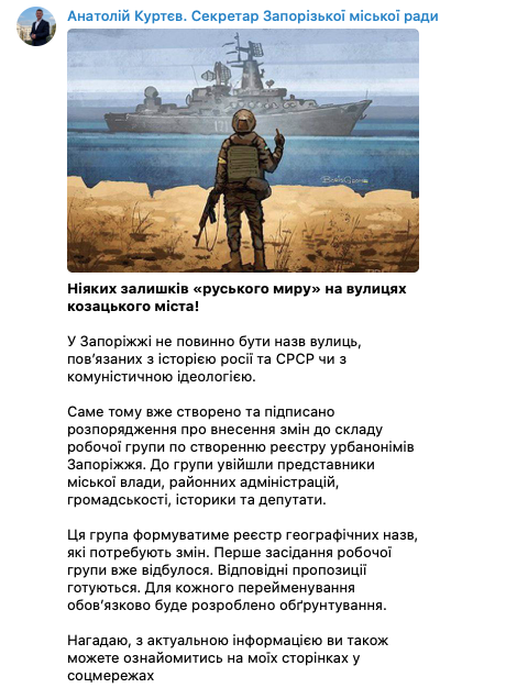 Запорожская мэрия занялась дерусификацией названий в городе. Фото: Википедия