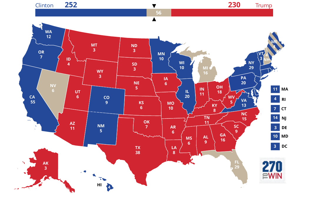 Исход президентских выборов в США определяется не всеобщим голосованием по всей стране, а коллегией выборщиков и зависит от результатов голосования в каждом из 50 штатов и Вашингтоне. Для победы главным фаворитам гонки, Клинтон или Трампу, необходимо заручиться голосами не менее 270 выборщиков из 538.