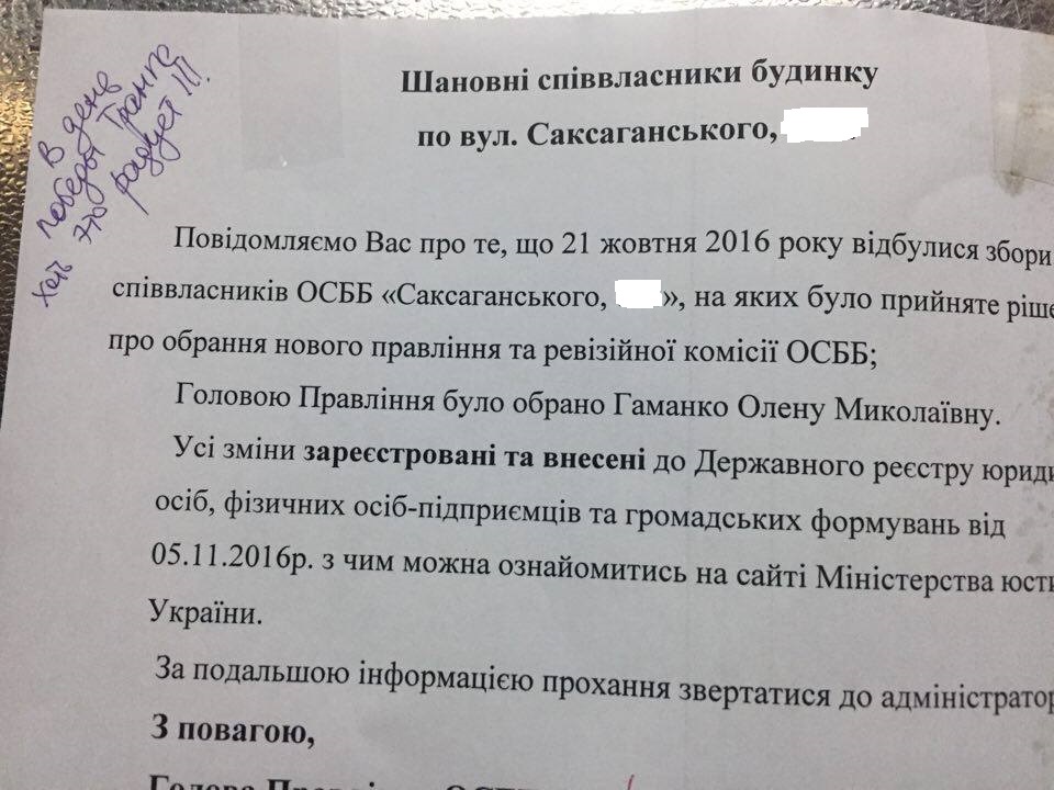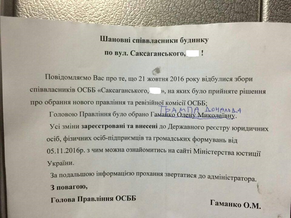 Обычные киевляне не остались в стороне от результатов выборов в США и даже шутят про Трампа. По меньшей мере, в одном из домов по улице Саксаганского в Киеве.