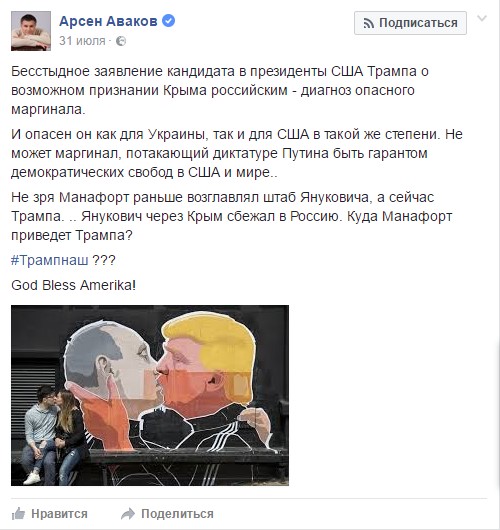 "И опасен он как для Украины, так и для США в такой же степени. Не может маргинал, потакающий диктатуре Путина быть гарантом демократических свобод в США и мире.. Не зря Манафорт раньше возглавлял штаб Януковича, а сейчас Трампа. Янукович через Крым сбежал в Россию. Куда Манафорт приведет Трампа?", - написал Аваков, дополнив свой пост "графическим" поцелуем между Трампом и Путиным.
