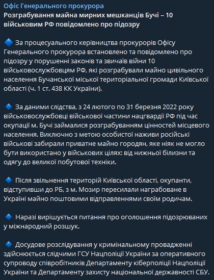 Десятерым военным РФ сообщили о подозрении из-за грабежа имущества жителей Бучи. Об этом сообщают в Офисе генпрокурора.