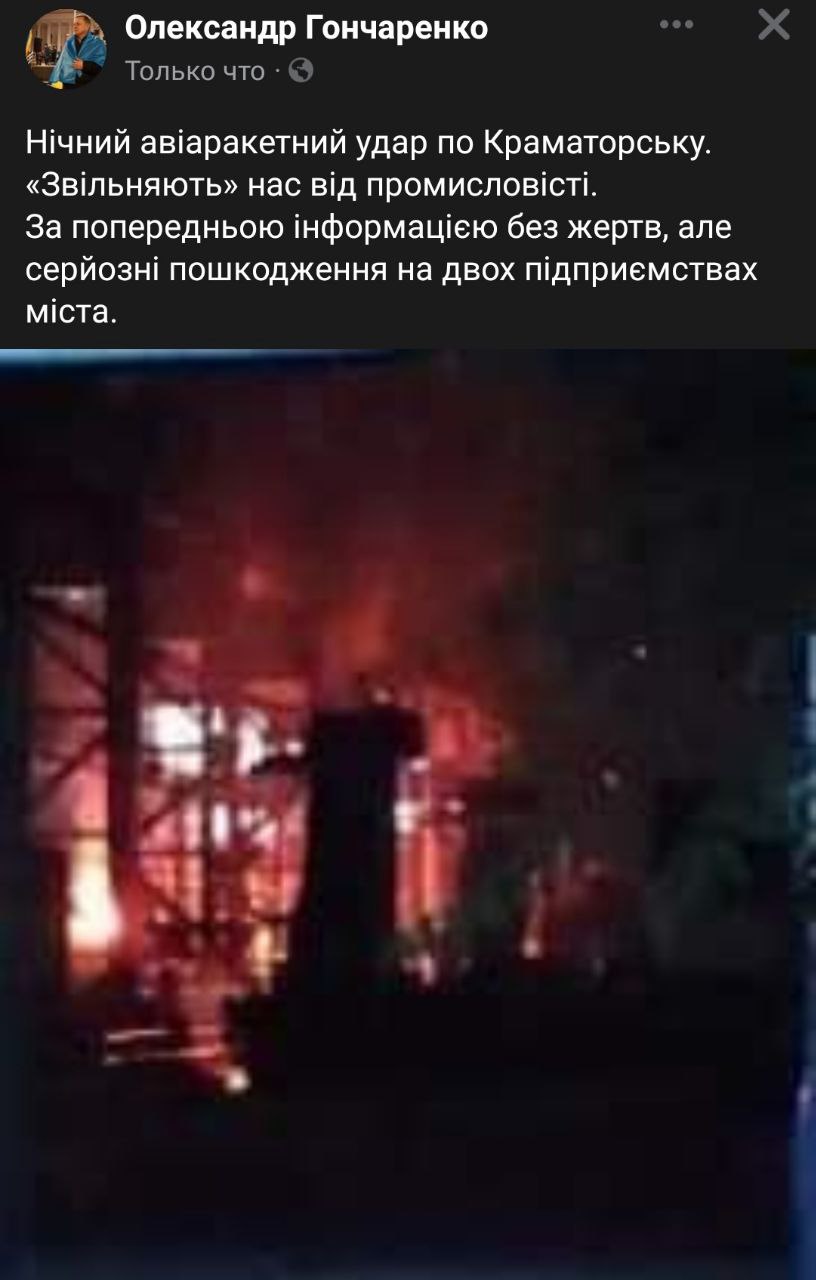 06:40 Ночной прилет по Краматорску. Мэр Александр Гончаренко сообщил о попаданиях по двум промышленным объектам.