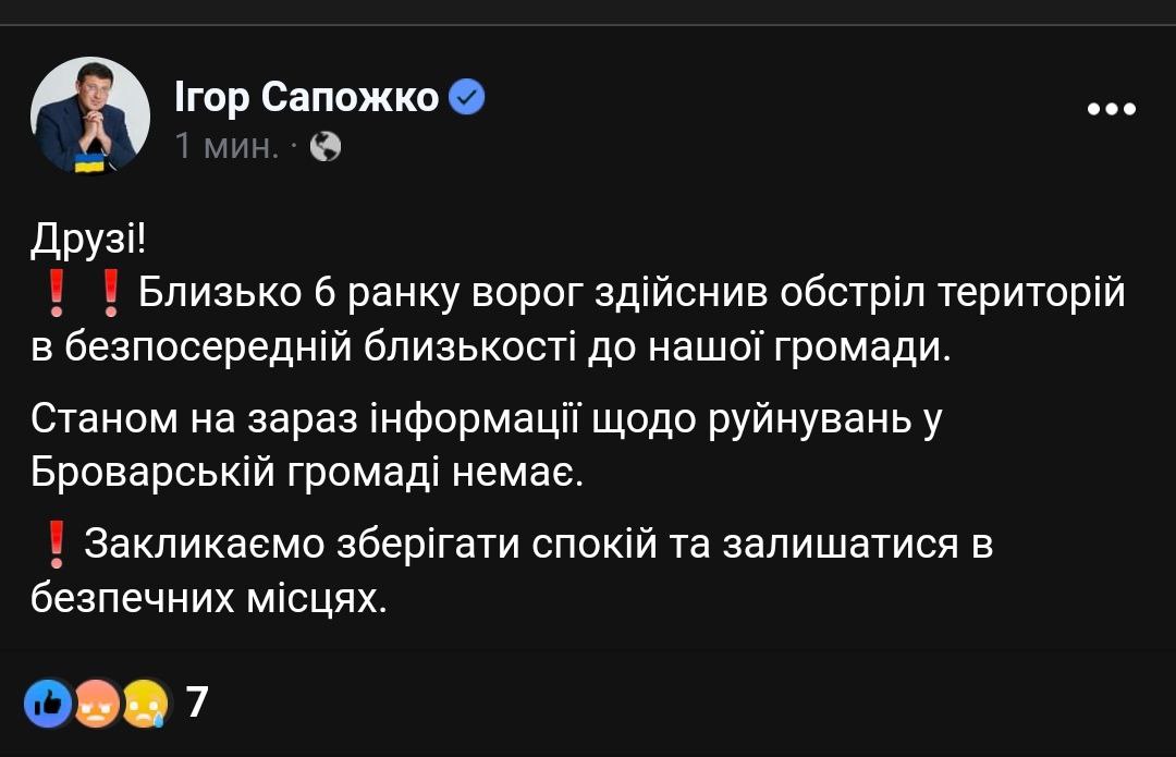 08:55 Мэр Броваров Игорь Сапожко также сообщает, что вследствие ракетного удара по Киеву пострадали объекты инфраструктуры в Дарницком и Днепровском районах.