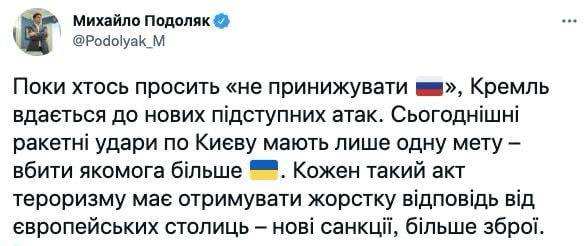 "Пока кто-то просит "не унижать Россию", Кремль прибегает к новым коварным атакам... Каждый такой акт терроризма должен получать жесткий ответ от европейских столиц – новые санкции, больше оружия", - пишет Подоляк.